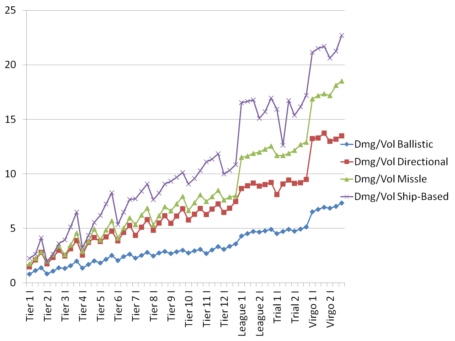 Chart of Minimum Damage per Volume space for each weapon of each weapon type (Ballistic, Directional, Missle, Ship-Based).